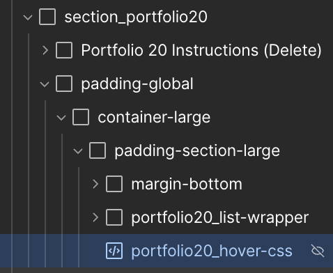 If you rename this component, remember to update the classes in the HTML embed named portfolio20_hover-css found inside the padding-section-large div.